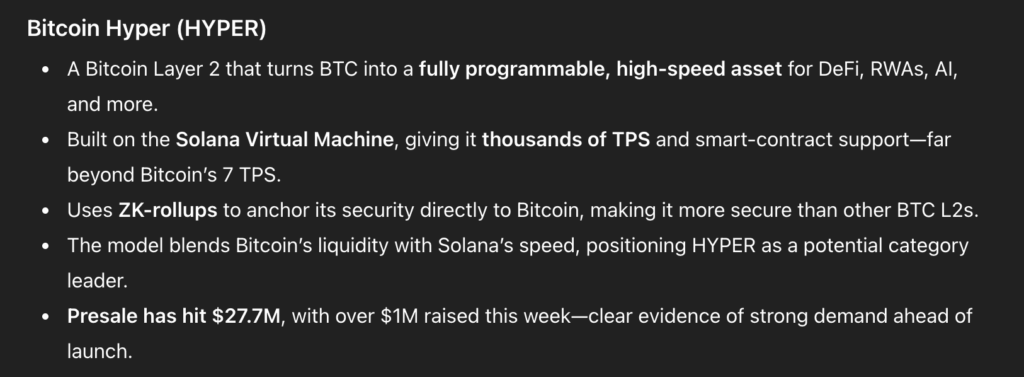 Bitcoin Hyper takes the very best of Bitcoin (its safety and liquidity) and combines it with the very best of Solana (speeds, low-cost transactions, and programmability). It’s a setup that might essentially change how Bitcoin operates.