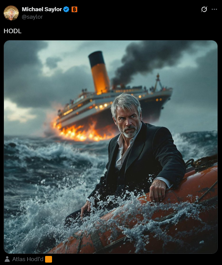Earlier within the day, Saylor posted a now-viral “HODL” meme on X, depicting himself escaping a sinking ship — a tongue-in-cheek message reinforcing his long-term stance. HODL, after all, stands for “Maintain On for Expensive Life,” a rallying cry in crypto circles throughout steep market pullbacks.