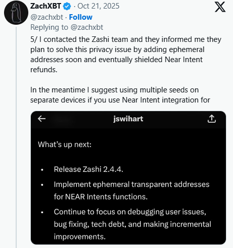 Not everyone seems to be thrilled with the technical tradeoffs but. Onchain investigator ZachXBT praised Zashi’s UX — even evaluating it favorably to Monero’s — however warned that refunds nonetheless route via clear ZEC addresses, which might leak some data. Each Swihart and NEAR co-founder Illia Polosukhin responded, confirming deeper shielded performance is coming.